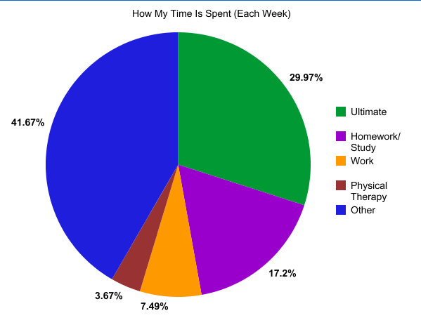 So, in conclusion, I do not spend most of my time doing Ultimate related things. However, when it is broken down into specifics, Ultimate definitely takes up the most amount of time. But honestly, I am okay with that. This is my life. I love the sport, the culture, the people, the teams. I would be a little nervous if my “Homework/Study” category was a significantly lower percentage. But I am doing just fine in school so it does not matter that I am spending more time with Ultimate. At the end of the day, this semester has been awesome and I’m extremely happy. And that can only mean that the amount of time I spend doing certain activities is, at the least, alright